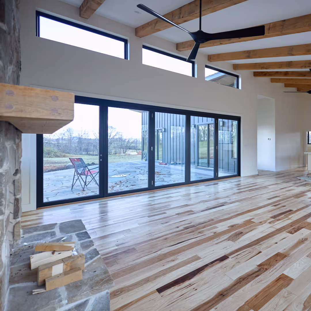Built for durability and long-term performance, the home features a standing-seam metal roof, fiber-cement board-and-batten siding, and wide-plank hickory flooring throughout. Large Andersen 400 Series windows bring in abundant natural light while framing views of the surrounding landscape.