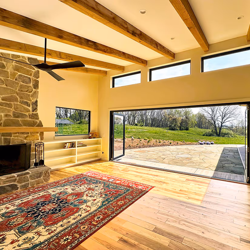 One of the standout features of the Davis–Stuart Residence is the 20-foot accordion door that opens the living room directly onto a stone patio. Designed and built by Seven Rivers Design + Build, this dramatic opening dissolves the boundary between interior and exterior spaces, creating a unified indoor–outdoor living experience ideal for entertaining, relaxing, and connecting with nature.